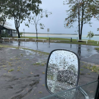 It rained all night, and we were serenaded to sleep by the most awesome thunderstorm. Daph surprisingly loves snuggling to the sound of rain on the Kombi roof. But Ern is somewhat distracted by the need to keep popping outside for leak management duties.